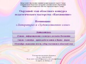 «Вдохновение» (окружной этап) Номинации: Литературное/Художественное слово 2025 год Итоговая-справка-«Вдохновение»-Литература-и-художественное-слово Положение окружного этапа_»Вдохновение» 2024 год ПОЛОЖЕНИЕ муниципального (окружного) этапа областного конкурса педагогического мастерства «Вдохновение» Форма заявки «Вдохновение» 2024 Итоговая справка конкурс «Вдохновение» окружной этап («Литературное»/»Художественное слово») Итоговый приказ № 441-од муниципального (городского) этапа областного конкурса педагогического мастерства «Вдохновение»